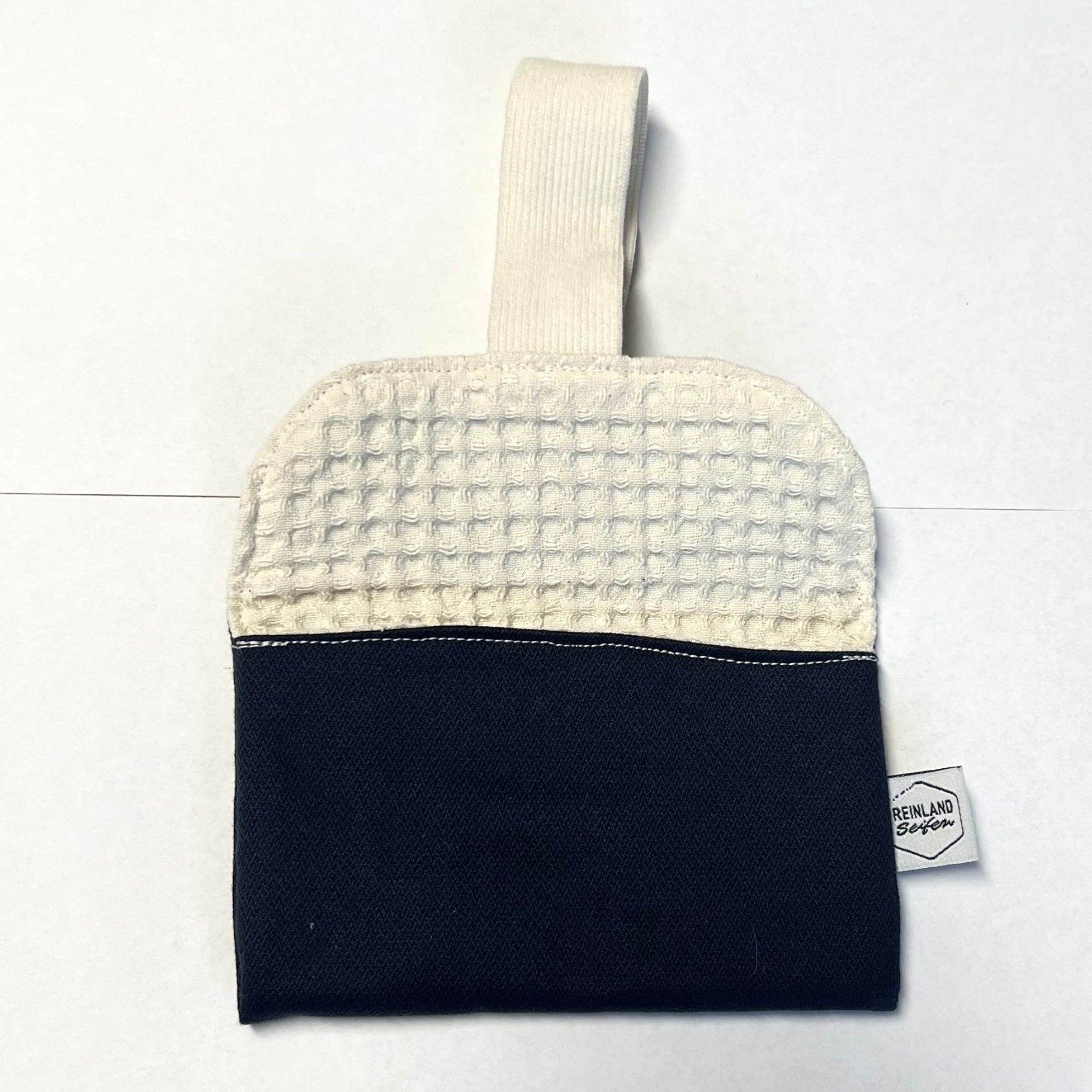 Die Seifentasche Blau ist aus hochwertigem, beschichteten GOTS-Bio-Baumwollstoff genäht. Gefüttert ist die Tasche mit BIO- und GOTS zertifiziertem Waffelpique.